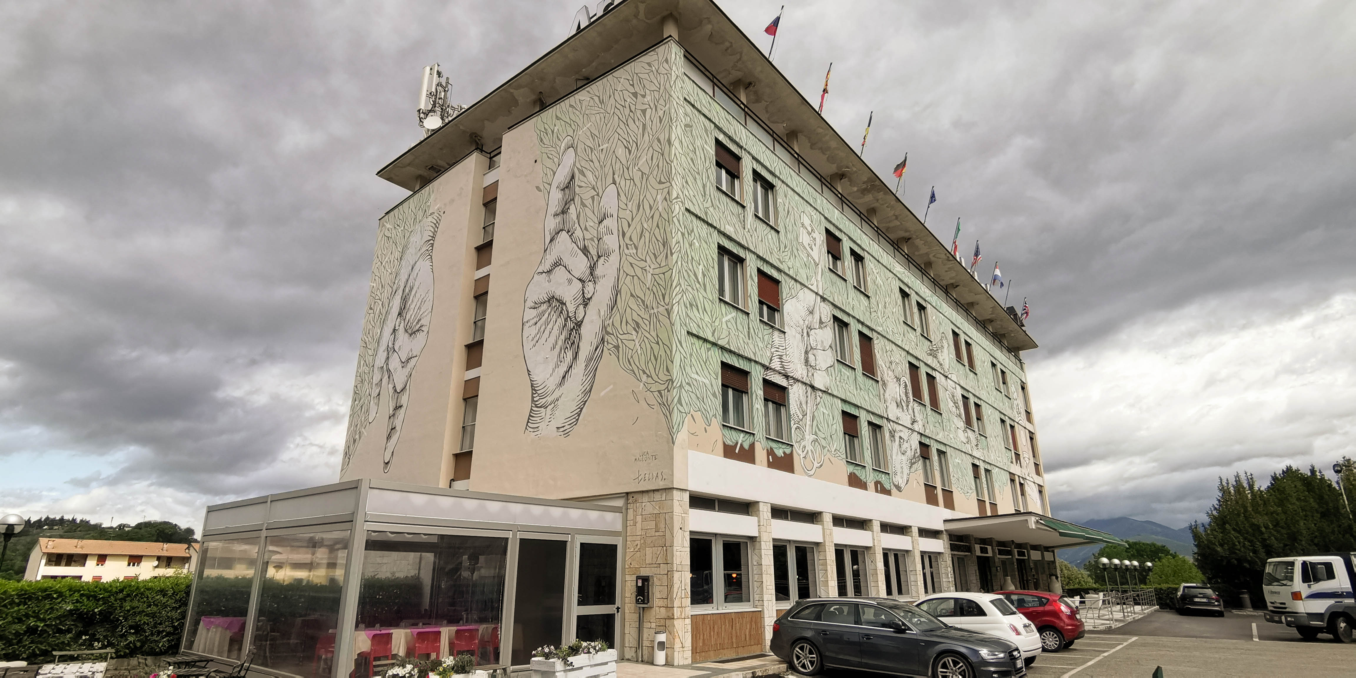 ![]() | Opera realizzata da Lucamaleonte e Tellas, riveste la superficie dell'Hotel Arca di Spoleto in occasione di Collicola OnTheWall 2015 |
