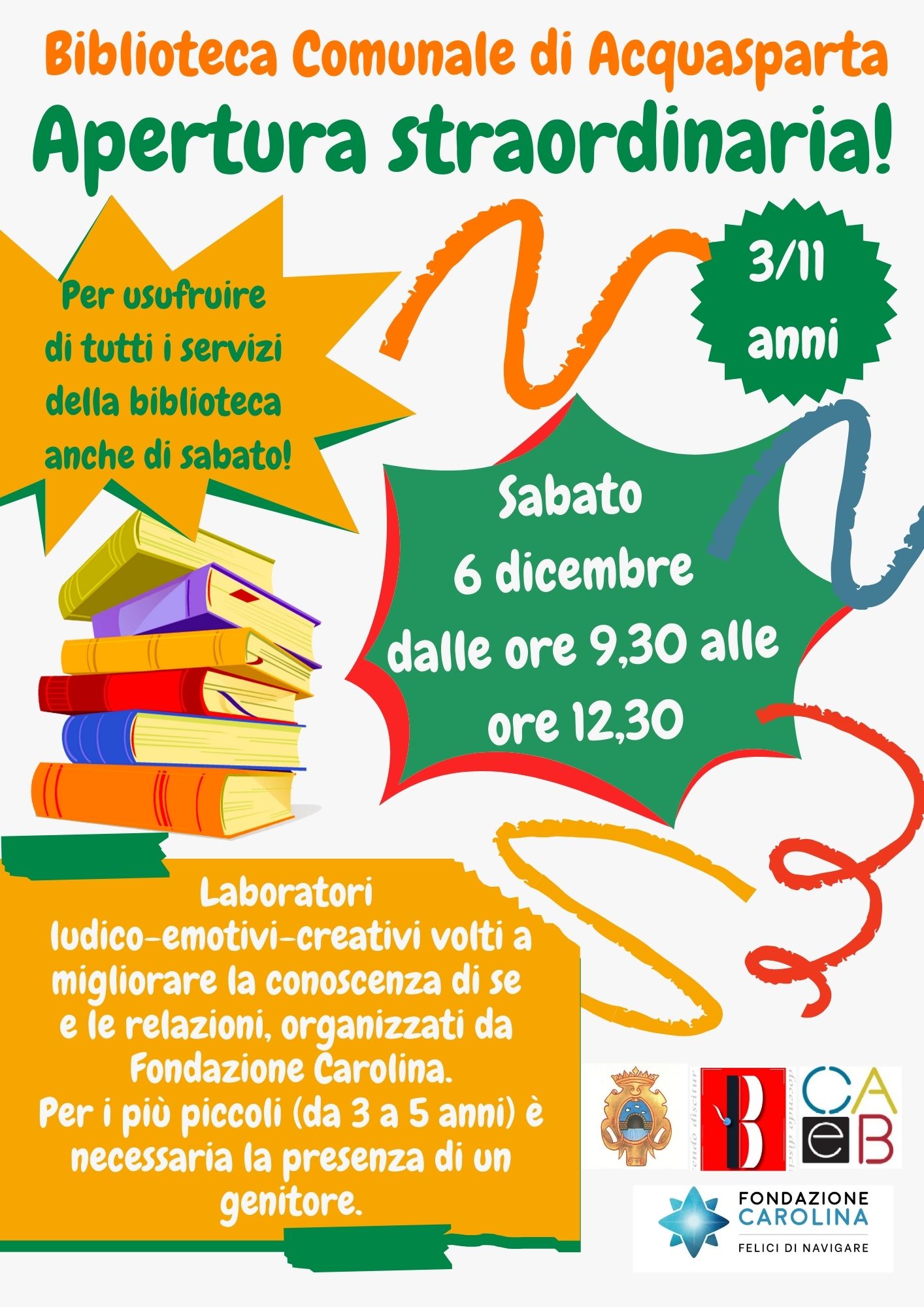 Saremo lì dalle 9:30 alle 12:30 per accogliervi anche nel weekend! Bimbi e ragazzi (3–11 anni), questa è per voi! Ci saranno laboratori creativi, emotivi e super divertenti organizzati dalla Fondazione Carolina, perfetti per giocare, conoscersi meglio e stare insieme in modo positivo. Per i più piccolini (3–5 anni) chiediamo solo che venga anche un genitore. Vi aspettiamo per una mattinata colorata, piena di energia e… libri!