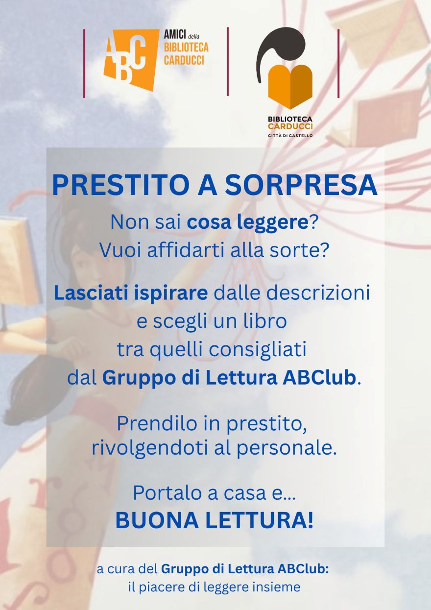 Lunedì 1 dicembre daremo inizio al "Prestito a sorpresa": se non hai ancora deciso cosa leggere e hai voglia di affidarti alla sorte, puoi prendere uno dei pacchetti natalizi che troverai a tua disposizione al front office. Sono i libri che il gruppo di lettura ABClub consiglia agli utenti della biblioteca. Non ti diremo né autore né titolo, ma solo poche frasi iniziali e in base a quelle potrai fare la tua scelta.