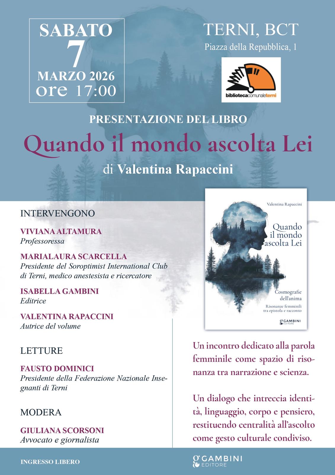 Sabato 7 marzo, caffè letterario ore 17.00, per Luci di donna, incontro con Valentina Rapaccini autrice di Quando il mondo ascolta Lei: cosmografie dell'anima. Risonanze femminili tra epistola e racconto (Gambini editore)