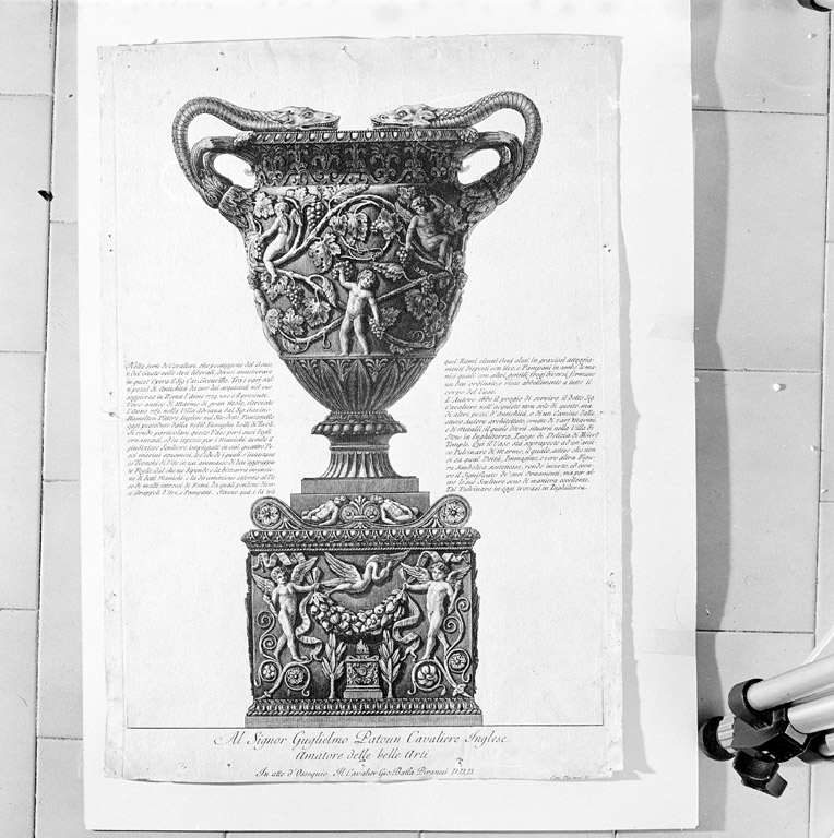 Dettaglio del documento Condividi Trova il documento in altre risorse ???scheda.servizi.button??? Stampa scheda Notifica con e-mail Facebook Twitter Vaso antico di marmo di gran mole, ritrovato l’anno 1769, nella villa Adriana dal Sig Gavino Hamilton Stampa Fa parte di Museo del Vino Torgiano (MUVIT). Torgiano (PG) Scrivi una recensione e condividila con gli altri lettori. Lo trovi in Scheda Immagini Commenti Giovan Battista Piranesi. “Vaso antico di marmo di gran mole, ritrovato l’anno 1769, nella villa Adriana dal Sig. Gavino Hamilton..” Quest'opera è distribuita con Licenza Creative Commons Attribuzione - Non commerciale Share Alike (CC-BY-NC-SA) 4.0 Internazionale https://www.umbriacultura.it/SebinaOpac/resource/SAM9014434
