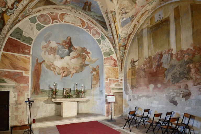 In the Chapel there is also depicted The Miracle of St Francis and the Swallows, which is reported in the “Fioretti” of St Francis (see TN below) “… began to preach, first ordering the swallows, who were calling, to keep silence until he had finished; and the swallows obeyed his voice." to have happened in Alviano, in 1212. In the fresco the face of the client, Donna Olimpia, is also portrayed.