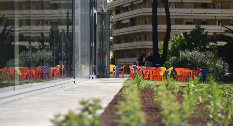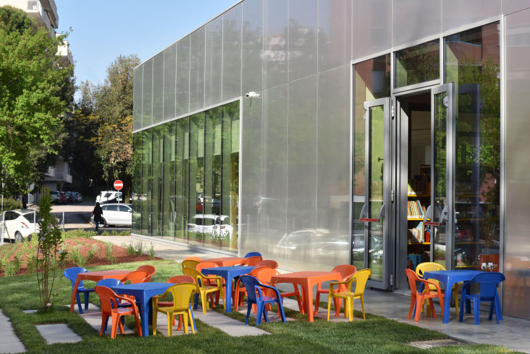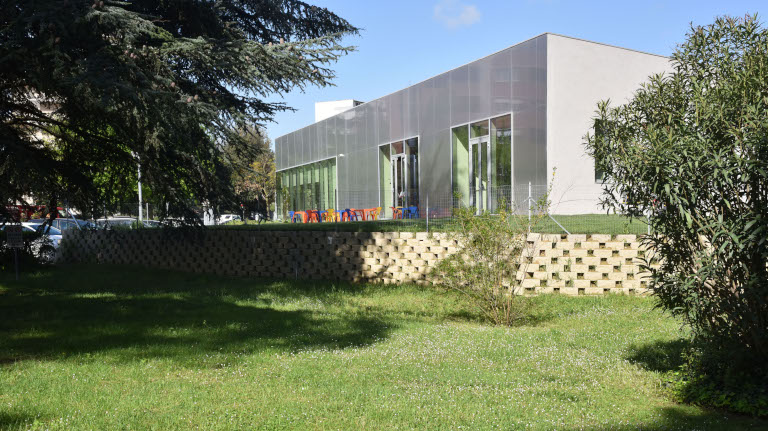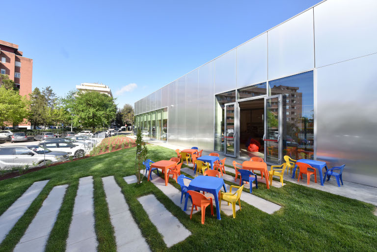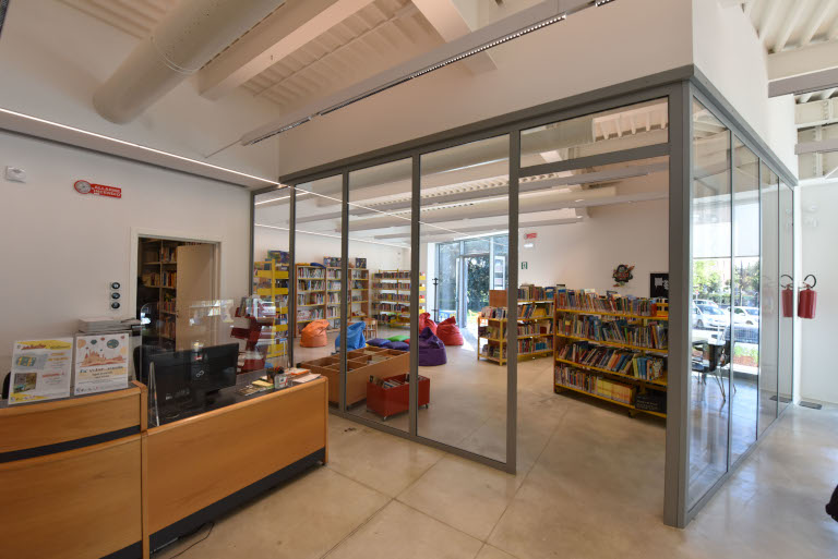 Sala ragazzi con arredi e materiali pensati per accogliere bambine e bambini della prima infanzia e con affaccio diretto sul giardino ed una Sala Polivalente per incontri e conferenze.