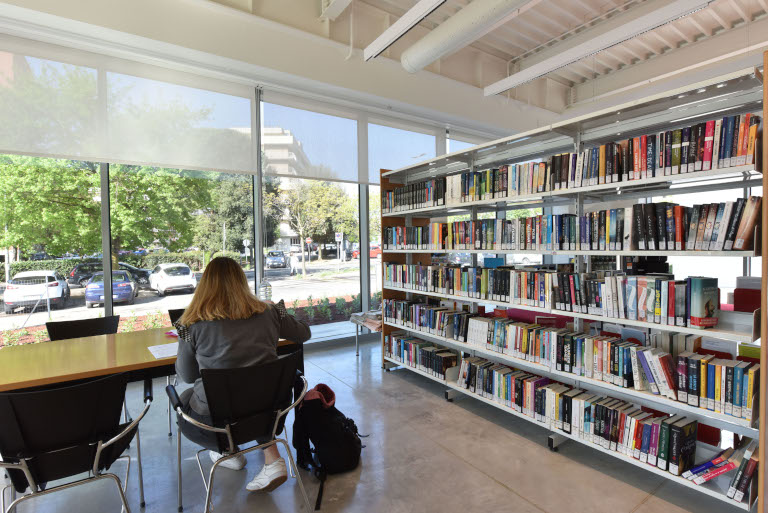 La biblioteca ha differenti aree a disposizione del pubblico: Sala di lettura con angolo periodici,