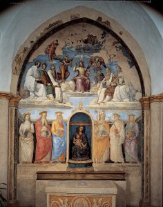 Raffaello, a causa delle molte commissioni che gli venivano da Firenze e successivamente da Roma, non poté portare a termine la decorazione, che fu completata dall’ormai anziano Pietro Perugino, suo maestro, nel 1521. Alla mano di Raffaello si deve il registro superiore con la Santissima Trinità e i santi, mentre, a Perugino i santi nel registro inferiore.