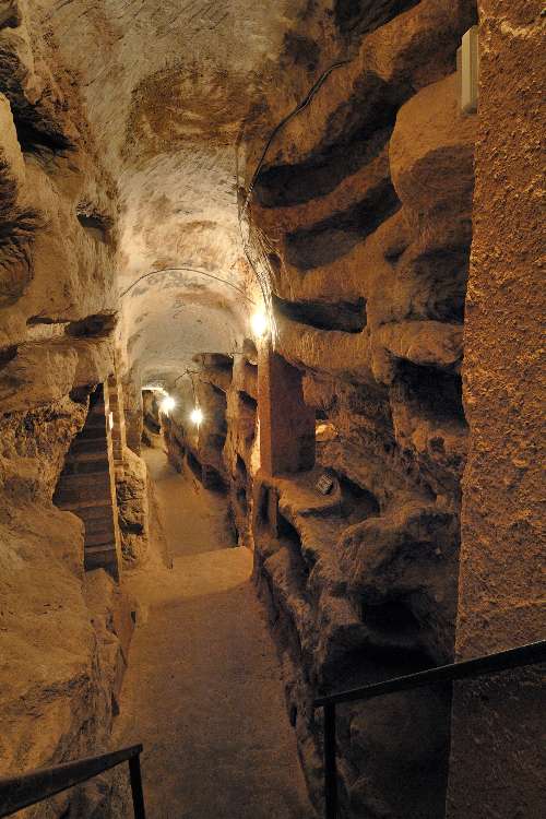 Reported for the first time in 1691 by local scholars under the name of Grotte di Traiano—Traiano’s Caves—the catacombs were rediscovered in 1900, and around the early 1940s were the subject of two excavation campaigns, which uncovered the majority of the galleries that were later used as air-raid shelter during the WWII conflict. Restoration works done to allow visitors to enter were carried out one after the other from 1996 to 1997, during which a new area—a small funerary Basilica strictly destined for cult activities—was discovered.