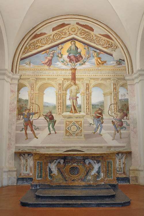 All’interno custodisce due importanti affreschi: il primo, di Pietro Vannucci detto il Perugino, rappresenta il Martirio di San Sebastiano (1505), il cui paesaggio sullo sfondo, con il lago e le dolci colline, è assai simile a quello che si apprezza appena fuori l'edificio; il secondo, di scuola peruginesca, raffigura la Madonna in trono con Bambino e Angeli musicanti, affresco staccato originariamente appartenuto alla chiesa di Sant’Agostino.