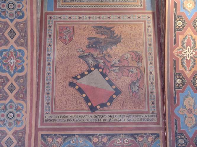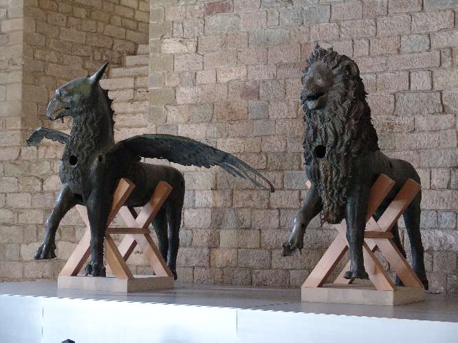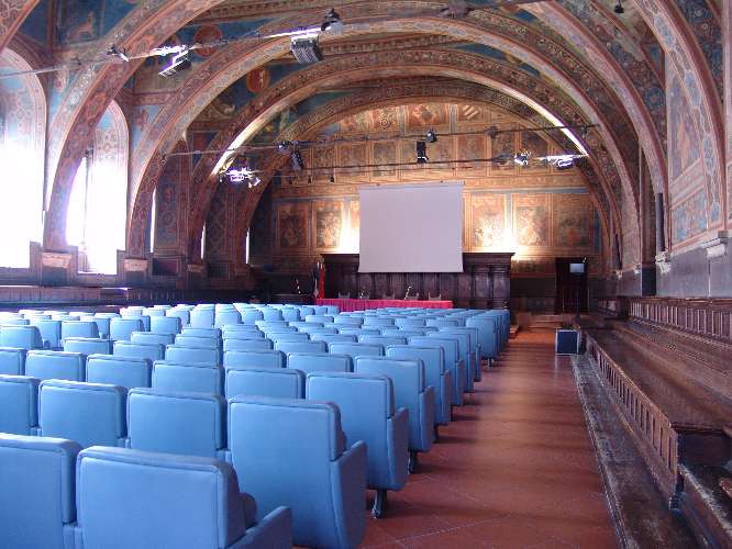 Walking up the stairs facing the square, entering inside, through the Gothic-arched portal surmounted by copies of the 13th century bronzes of the Griffin and the Lion—the original symbols of the town are kept inside the palace—one enters into the Sala dei Notari, the Hall of the Notaries’ Guild. Originally the hall of the popular assemblies, it is a rectangular vaulted room supported by eight huge Romanesque arches, and is entirely frescoed depicting legends, tales and Biblical stories that can be dated from the last decade of the 13th century—probably the work of the Master of Farneto and the Master Expressionist of Santa Chiara—and with coats of arms of the Podestà and the various Captains of the People, who governed the town.