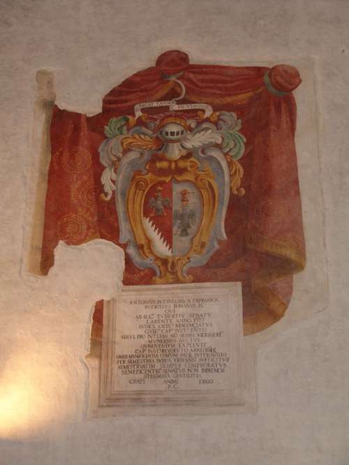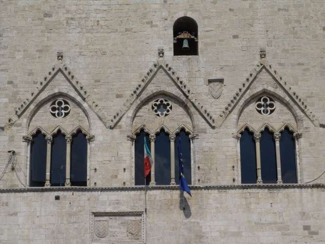 Above the voltoni, the three Gothic windows on the first floor stand out for their elegance. These are similar in style to some medieval Venetian edifices—apart from being similar to the windows of the second floor of Palazzo dei Priori in Perugia—each one consists of three lancet windows, with a circular motif in the tracery superimposed by a tympana, which provides light for the Hall of the Capitano del Popolo—Capitan of the People—a large room in which there are remnants of frescoes from the 14th century. On the same floor there is the Civic Museum archaeological collection that preserves archaeological finds found in the Tuderte territory.