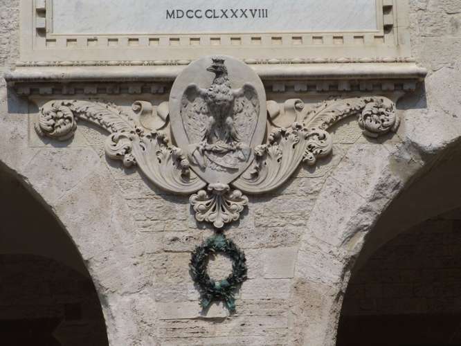On the ground floor, behind the staircase leading to Palazzo del Popolo, two large round arches lead to the so-called voltoni—big vaults—a portico used as an atrium.