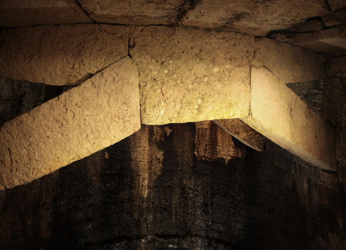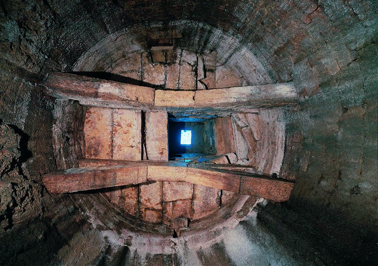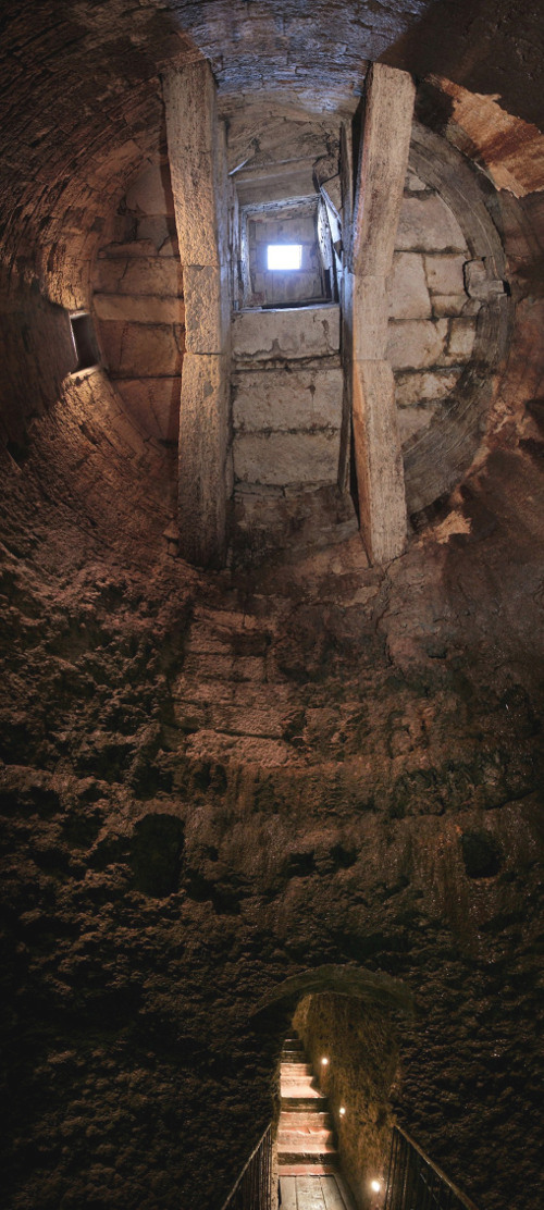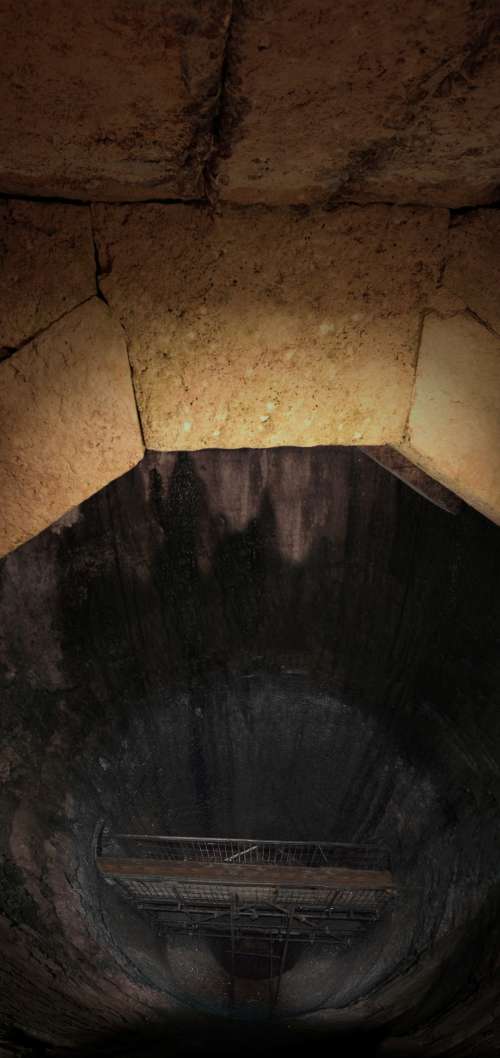 Constructed with the same blocks of Travertine as the wall belt, it was excavated into the so called “tassello mandorlato”—a coarse-grained sedimentary rock composed of rounded fragments—that is typical of the town. The well is composed of a cylindrical shaft more than 30 meters deep with a maximum diameter of 5,60 meters, which narrows while going down—like a funnel—into the lower part. It presents two trusses, “capriate”, supporting its roof, each one consists of four large blocks of travertine—two horizontal and two oblique—held together by a central keystone. This system, which is technically very similar to the cistern in Via Caporali on the opposite side of the city, served to support a floor pavement made of stone slabs of travertine where an opening allowed water to be drawn from. This work of engineering, whose centrality and monumentality does not leave doubt as to its public destination of use, dates—basing the judgment on the technical similarities found with the wall belt—from the 3rd century B.C.