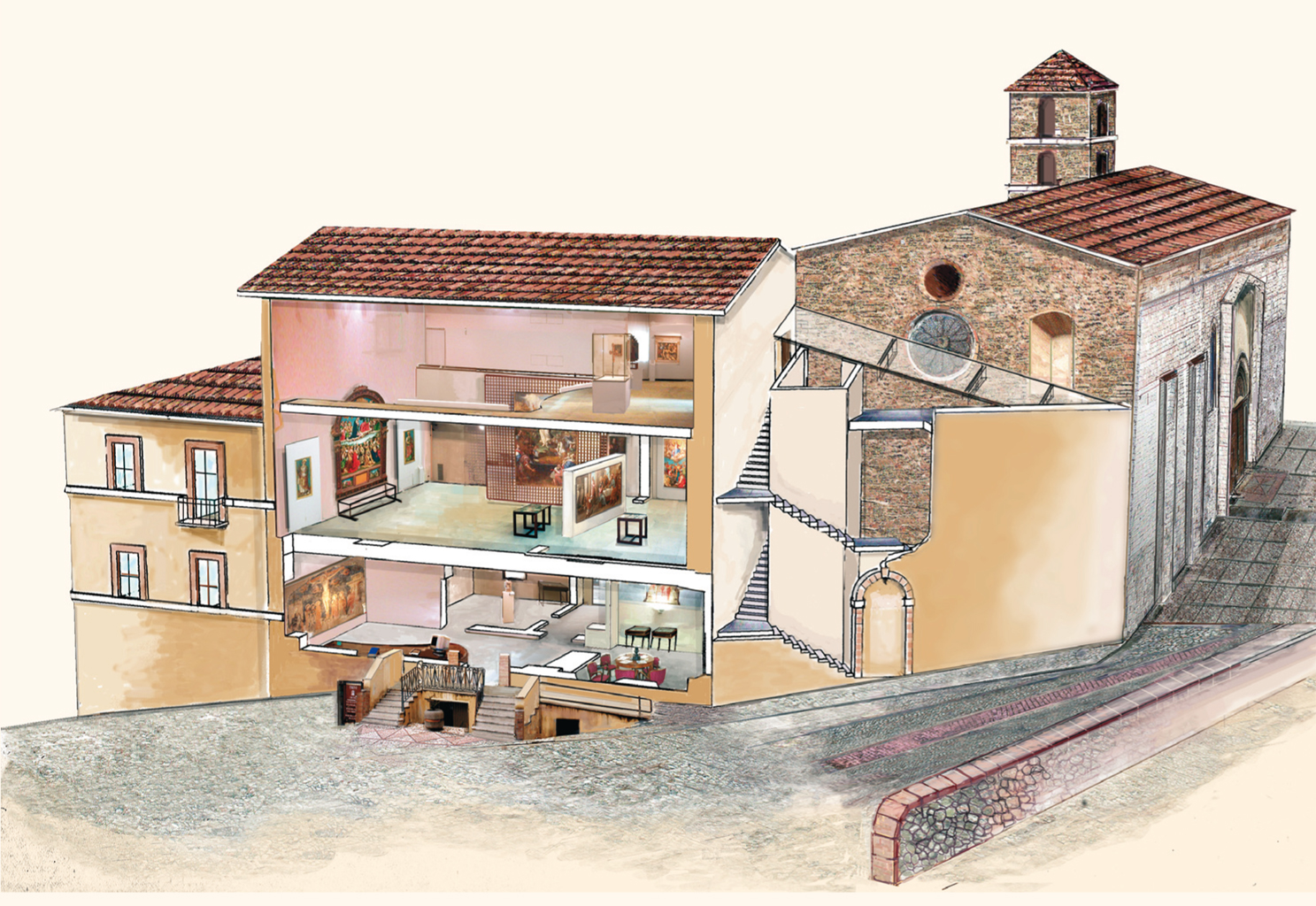 Il complesso museale allestito all’interno dell’ex convento di San Francesco, edificato a partire dal XIII secolo, ricostruito e decorato nella prima metà del XVII, con un chiostro esterno affrescato da Bernardino Gagliardi con le Storie della vita di San Francesco, sorge nel centro storico di Trevi e ospita la Raccolta d'arte di San Francesco e il Museo della Civiltà dell'ulivo. In particolare, la Raccolta d'arte di San Francesco, rinomata per le importanti opere due-trecentesche di scuola umbra e i dipinti su tela eseguiti tra il XVI e XVIII secolo, si articola in due distinte sezioni. Al piano terra, disposta su tre sale, si trova la sezione archeologica, che raccoglie reperti italici e di epoca romana e un corredo funebre proveniente dalla necropoli longobarda della vicina Pietrarossa. Nello stesso piano è ospitata una sezione dedicata alla città e al territorio con materiali che ne documentano gli sviluppi. La sezione storico-artistica, allestita ai piani superiori, espone opere entrate a far parte della raccolta in seguito alle demaniazioni del patrimonio ecclesiastico avvenute dopo l'unità nazionale. Si tratta prevalentemente di tavole trecentesche e di importanti dipinti su tela eseguiti tra il XVI e XVIII secolo, tra cui di particolare interesse è L’Assunzione della Vergine del veronese Alessandro Turchi detto l’Orbetto. Tra le opere raccolte spiccano in particolare il Gonfalone processionale raffigurante La Madonna della Misericordia e Monogramma, eseguito nella seconda metà del XV secolo da un seguace di Niccolò Alunno e L’Incoronazione della Vergine, del 1522, eseguita da Giovanni di Pietro detto lo Spagna per l'altare maggiore della chiesa di San Martino. Nell’allestimento, numerosi sono i rimandi ai luoghi di provenienza delle opere, primo fra tutti il vicino santuario della Madonna delle Lacrime, di proprietà comunale, che ospita affreschi dello Spagna e del Perugino. All’interno del complesso si trova anche il Museo della Civiltà dell'ulivo, interamente dedicato all'olio extra vergine di oliva DOP. Lo spazio è articolato in quattro sezioni: “Botanica”; “Conosciamo l'olio e l'ulivo”; “L'ulivo simbolo di pace” e “Storia dell'ulivo”. Attraverso pannelli informativi, postazioni multimediali, reperti archeologici e macchine olearie, il museo documenta i diversi aspetti legati alla coltura dell'ulivo, che così fortemente caratterizza il paesaggio delle colline circostanti e l'economia di tutto il territorio. Un vero e proprio viaggio, con audio-guida, nel microcosmo legato alla produzione dell'olio. Fa parte del Circuito museale cittadino, insieme alla Raccolta d'arte di San Francesco e al Museo della Civiltà dell'ulivo anche Palazzo Lucarini, con i suoi spazi dedicati alla promozione dell’arte contemporanea mediante mostre e manifestazioni complementari.
