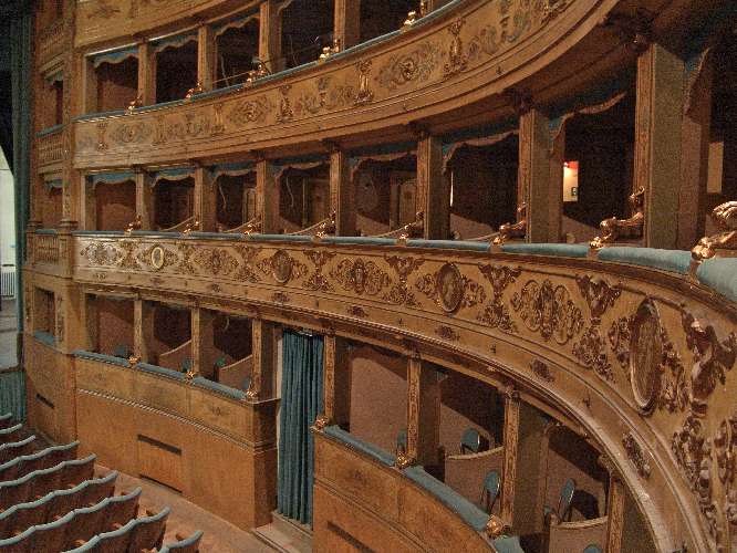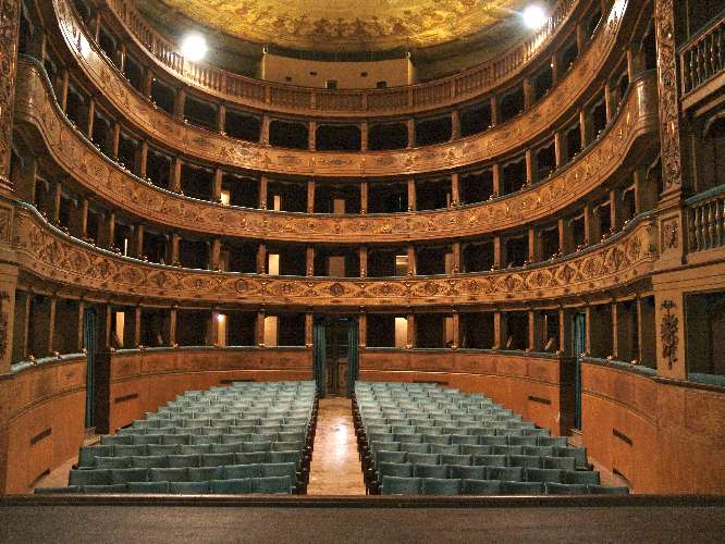Nacque come “Teatro della Nobile Accademia del Casino”, tutto in legno, con quattro ordini di palchi e pianta quadrangolare, rivelatasi ben presto inadatta alle nuove esigenze del melodramma e della commedia. L’Accademia ne decise pertanto la demolizione (1765) affidandone la ricostruzione all’architetto Pietro Carattoli. La nuova pianta, ispirata al Teatro Argentina di Roma, fu a ferro di cavallo, struttura in muratura, 82 palchi distribuiti in 4 ordini (di cui quello inferiore, sostenuto da colonnine precedute da balaustra, con ricca decorazione). La fronte dei palchi fu ornata con cammei in stucco da Carlo Spiridione Mariotti. Il teatro deriva il nome dal bellissimo uccello sacro a Giunone, la dea che trionfa nel sipario dipinto dall’anconitano Francesco Appiani nel 1772. Del 1814 è la decorazione del plafone e la sostituzione del sipario già logoro con una rappresentazione della “Riedificazione di Perugia ordinata da Augusto”, entrambe opera del romano Gaspare Coccia. Del 1856 consistenti interventi di restauro, quali la ricostruzione del tetto e della volta, l’applicazione delle camere a canne anche alle corsie del quarto e del quinto ordine, che fu trasformato in loggione. La nuova decorazione di tutto il teatro e del sipario fu affidata al pittore Nicola Benvenuti.