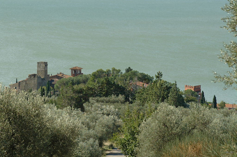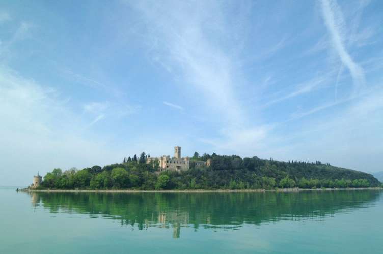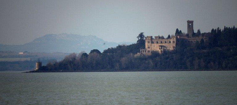 La grande mole della villa si erge sull’estremità meridionale dell’Isola Maggiore del lago Trasimeno, circondata dalla folta vegetazione del proprio parco.